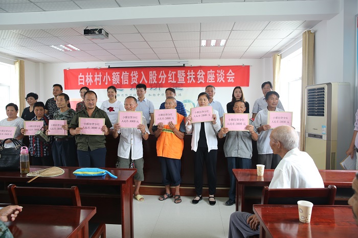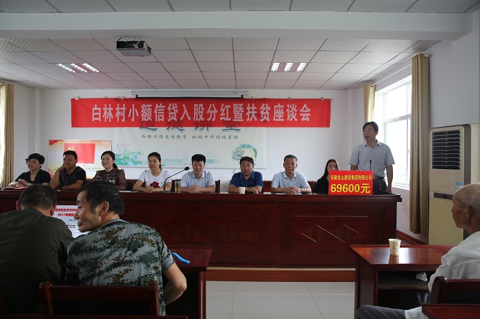 9月4日上午,白林村在村委會二樓會議室召開小額信貸入股分紅暨座談會,安徽龍山建設集團總經理鄭生華、副總經理程志受董事長的委托代表安徽龍山建設集團參加座談會,會議由白林村鄧書記主持,白林村姚書記等相關負責人和53戶貧困戶代表共同參加了會議。