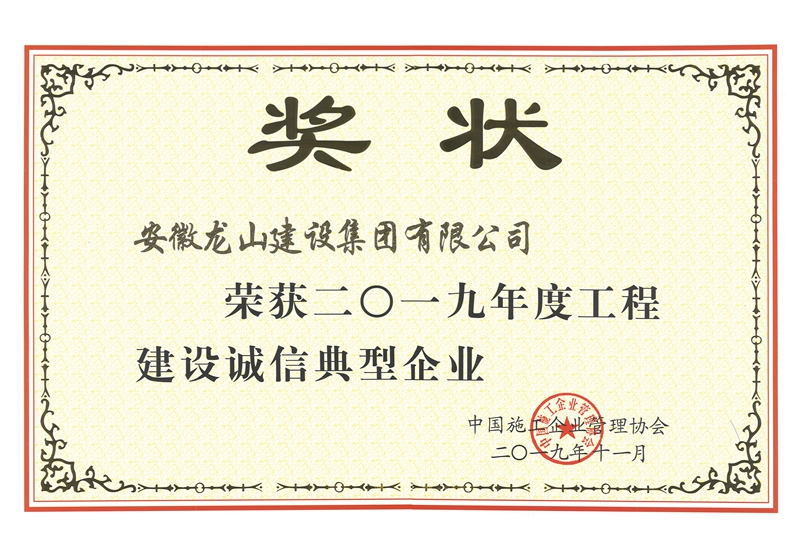 安徽龍山建設集團有限公司榮獲“2019年度工程建設誠信典型企業”稱號