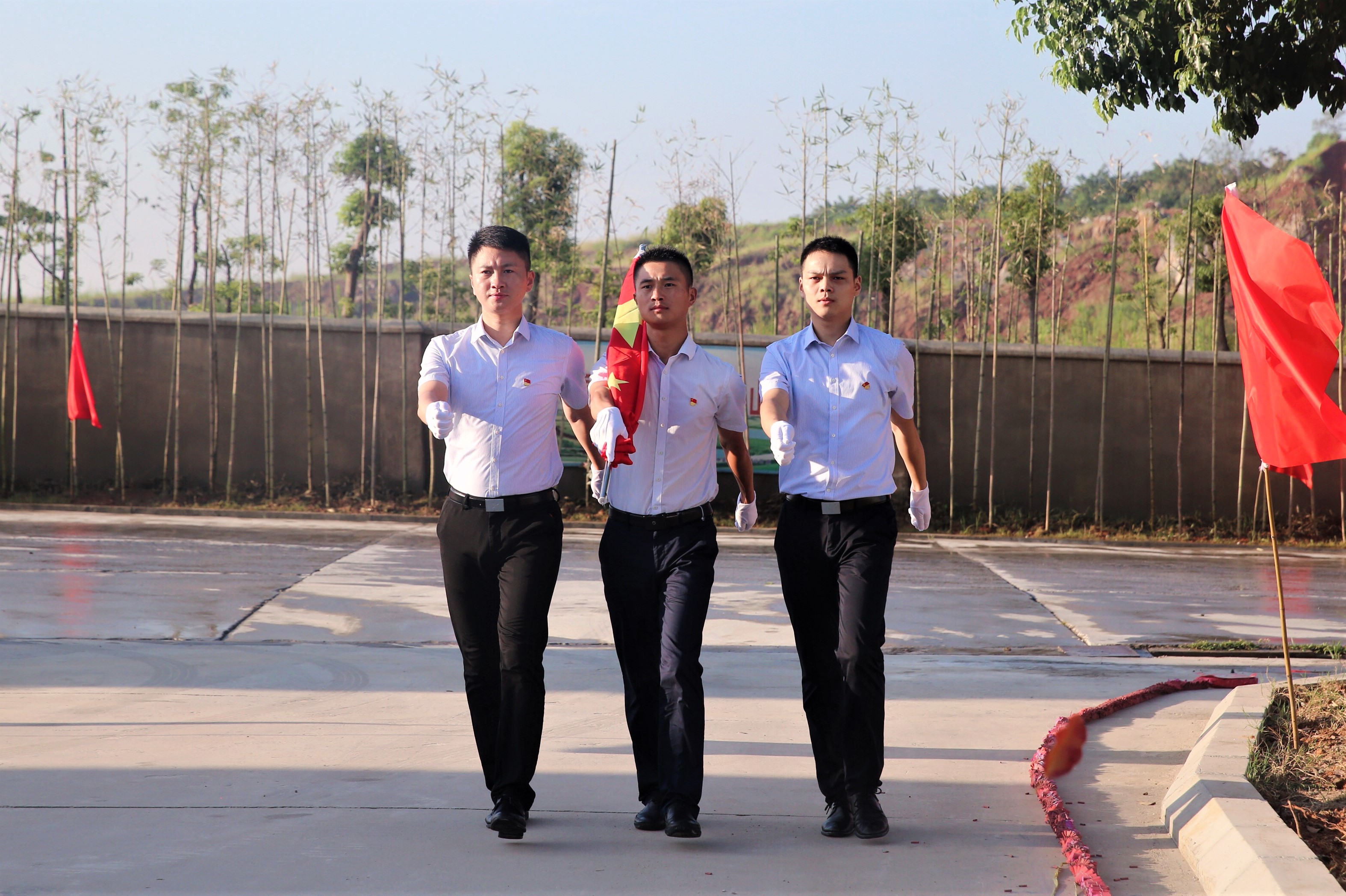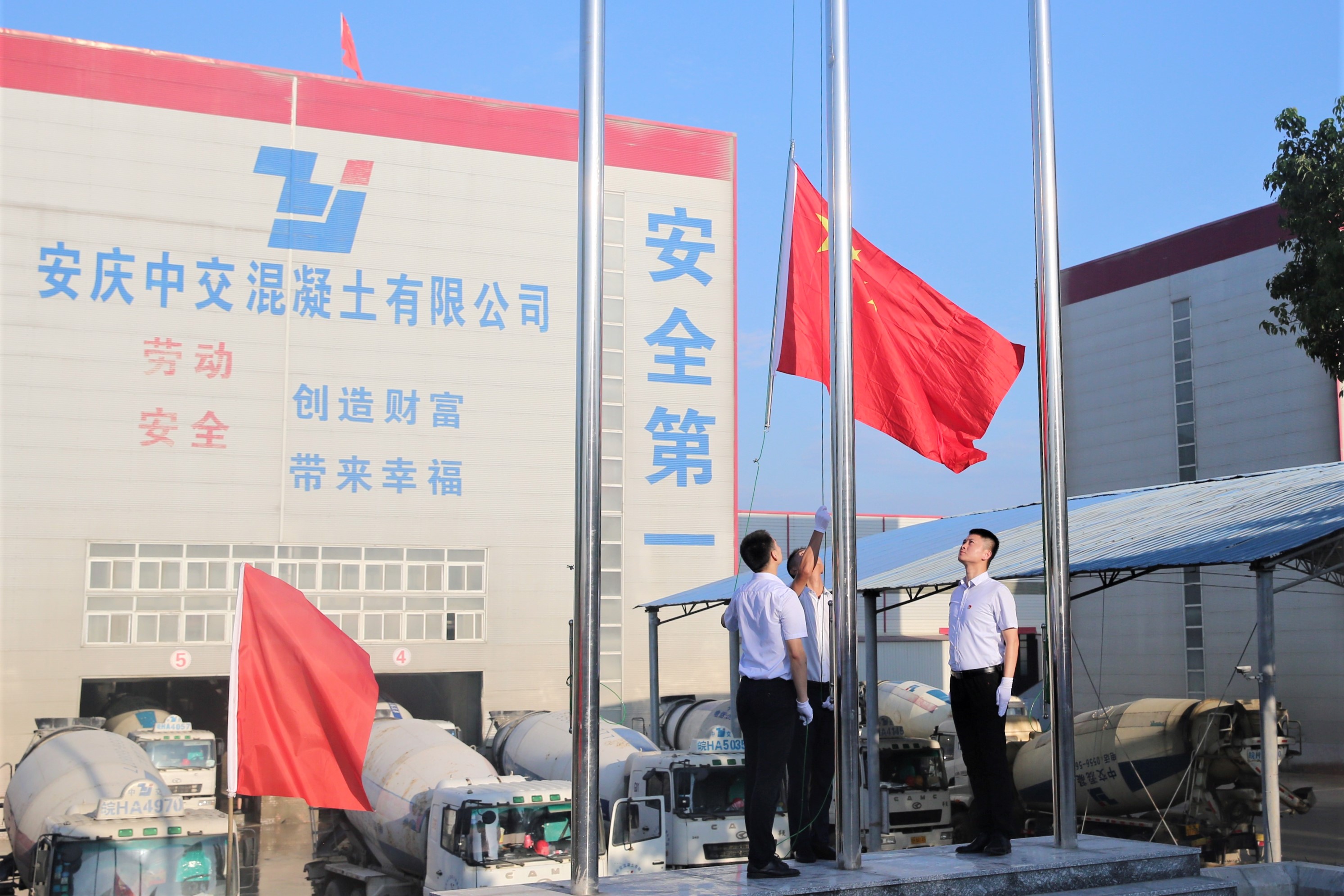 早上7時(shí)整,伴隨著雄壯的義勇軍進(jìn)行曲,升旗手昂首闊步邁入辦公樓廣場(chǎng)前,全體員工列隊(duì)迎接,在催人奮進(jìn)的國(guó)歌聲中,五星紅旗冉冉升起。隨著集團(tuán)公司董事長(zhǎng)的一聲號(hào)令,現(xiàn)場(chǎng)鞭炮鳴響,彩旗飄揚(yáng),生產(chǎn)線一片繁忙,車輪滾滾,機(jī)器轟鳴。