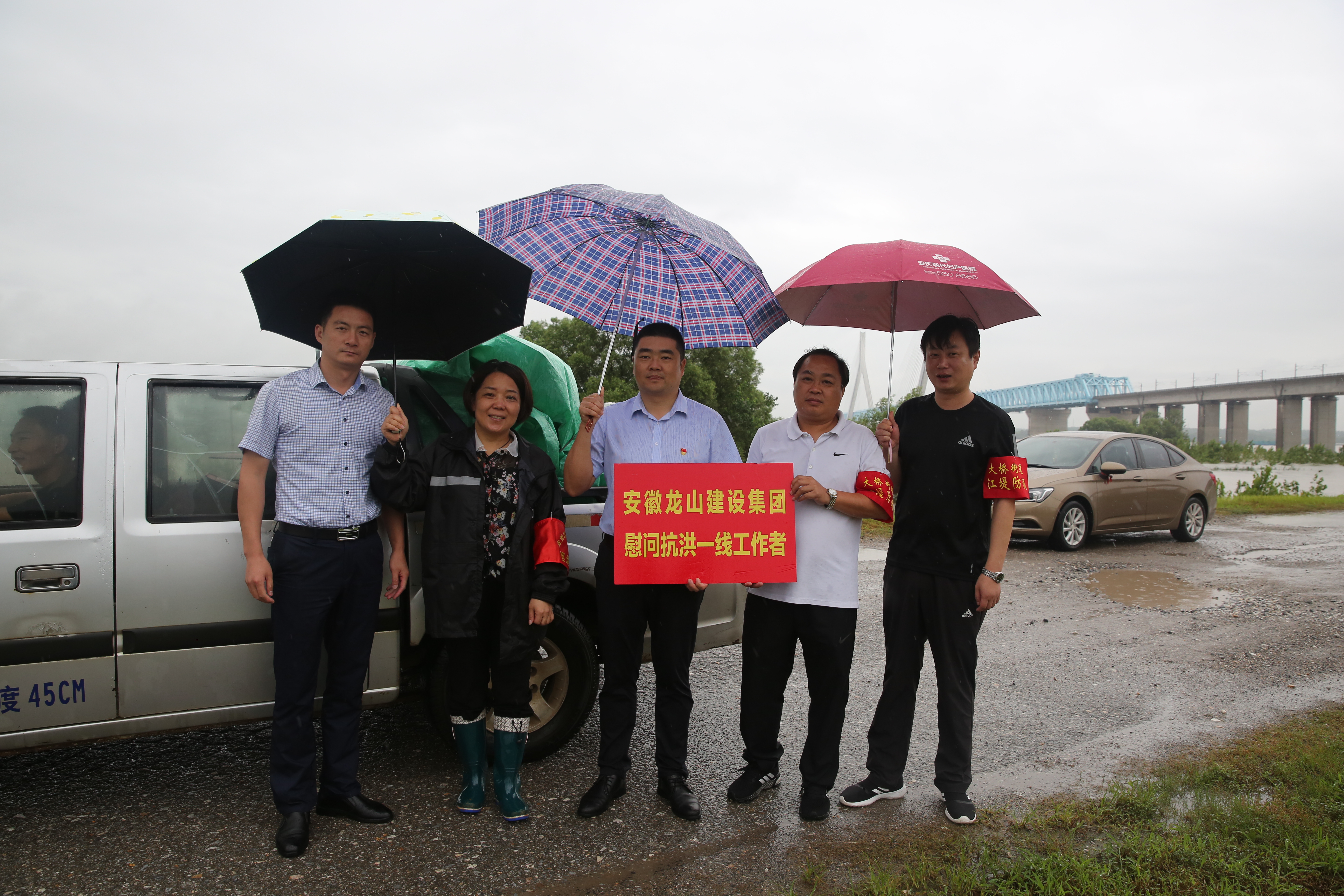 7月13日上午,集團公司董事長汪小苗又委派集團公司副董事長朱遠飛,前往安廣大堤大橋街道辦事處防汛救災駐地,慰問連續多日奮戰在防汛抗洪一線工作者。上午9時許,滿載著救生衣、礦泉水、方便面的貨車抵達江堤旁,全體人員在雨中將一箱箱物資分送到一線人員手中。