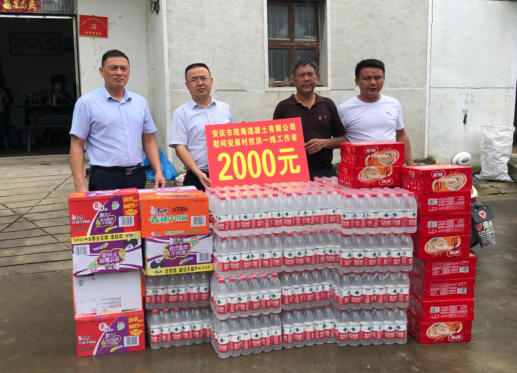 7月29日上午,集團公司董事長汪小苗委派安慶市觀海混凝土有限公司負責人程志清、副總經理吳士和前往安慶市大觀區海口鎮安原村慰問防汛抗洪一線的干部群眾,為堅持奮戰在一線的同志們送去了2000元現金以及礦泉水、方便面、八寶粥等慰問品,表達公司全體員工對堅守一線的防汛人員的敬意與感謝。