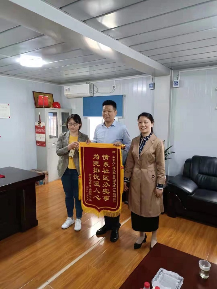 菱湖公館附屬學校項目部此次無償修繕行為得到了新西河村小區百姓的認可。5月4日上午,新河路街道辦事處特委派新河路街道黨工委副書記、辦事處副主任程爽,龍獅橋社區黨委書記、主任孫玉萍來到項目部,為集團公司送上了“情系社區辦實事,為民排憂暖人心”的錦旗。