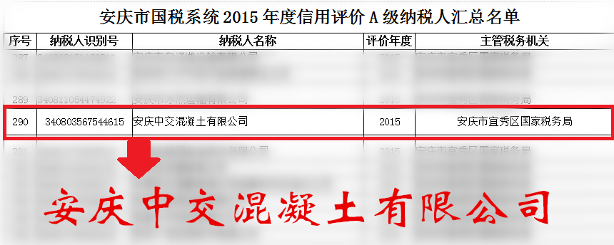 日前,“安慶國稅2015年度信用評價A級納稅人”名單新鮮出爐,安慶中交混凝土有限公司榜上有名。