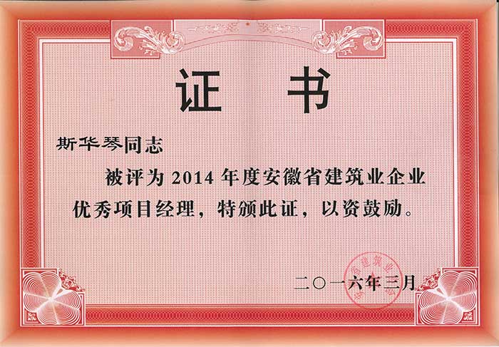 斯華琴同志榮獲“安徽省建筑業企業優秀項目經理”稱號