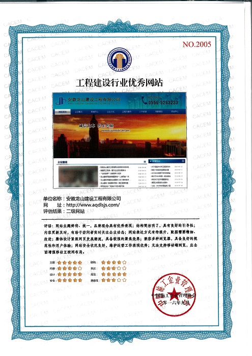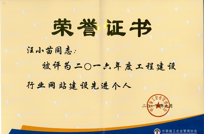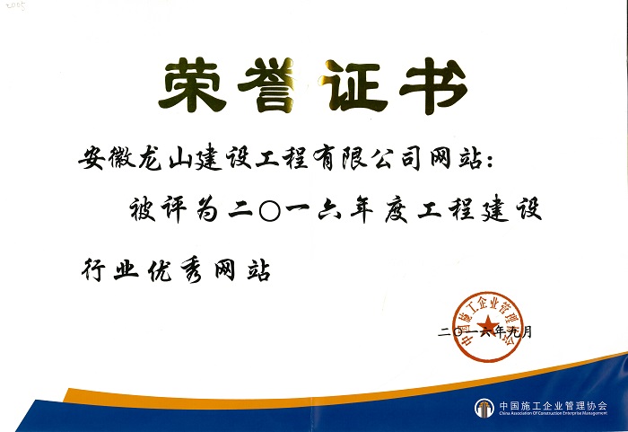 2016年9月20日至21日,中國施工企業管理協會在北京召開的“全國工程建設行業第二屆互聯網大會”落下帷幕,集團公司董事長汪小苗參加會議。安徽龍山建設集團有限公司被評定中國工程建設行業二級優秀網站、董事長汪小苗被為網站建設先進個人。