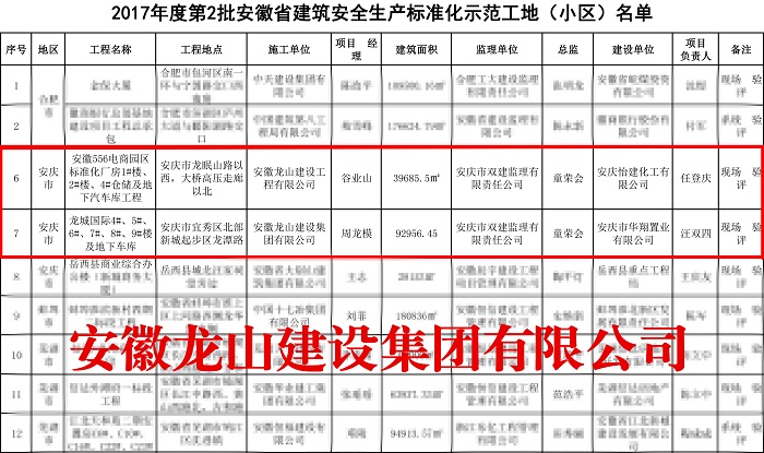9月7日,由安徽龍山建設集團有限公司承建的“安徽556電商園區標準化廠房1#樓、2#樓、4#倉儲及地下汽車庫工程項目”和“龍城國際4#-9#樓及地下車庫項目”順利獲得“安徽省建筑安全生產標準化示范工地(小區)”稱號,兩份榮譽同攬囊中,可謂捷報頻傳。