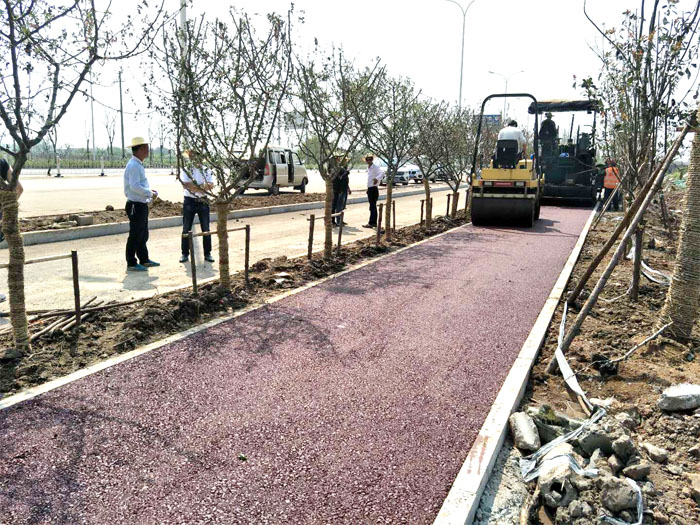 此次采用彩色瀝青混凝土攤鋪人行道,不僅是因為彩色瀝青色澤鮮艷持久、不褪色、維護方便,還具有良好的彈性和柔性,適合老年人和小孩散步,減少了對環境的污染。同時,也構成我市城市形象一道亮麗的風景線。